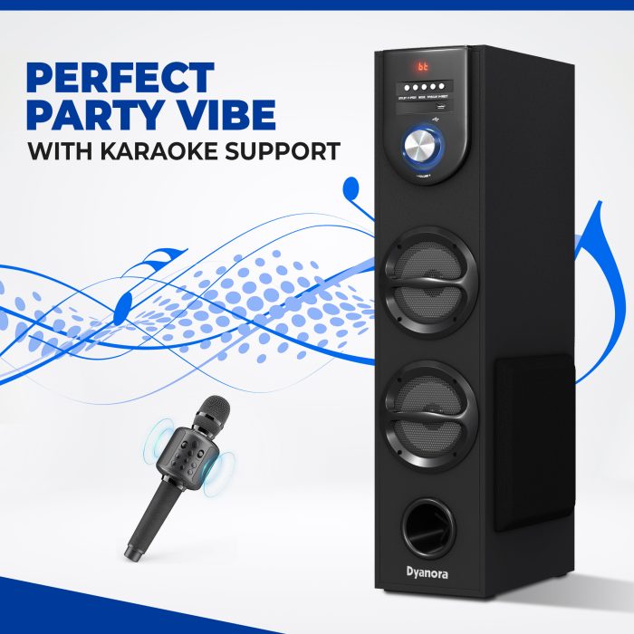 Dyanora brings you a High Quality 50 Watt Tower Speaker with wireless Bluetooth connectivity. Dyanora Bluetooth Tower Speaker is Sleek, Trendy, Classy and designed for the Ultimate Music listening experience. This tower speaker comes with the most advanced Bluetooth technology for a lossless music experience. Connect your Mobile phones, Laptop or your smart TV for a seamless music or movie experience. This tower speaker has versatile multimedia input options like AUX, USB along with Karaoke compatible.
